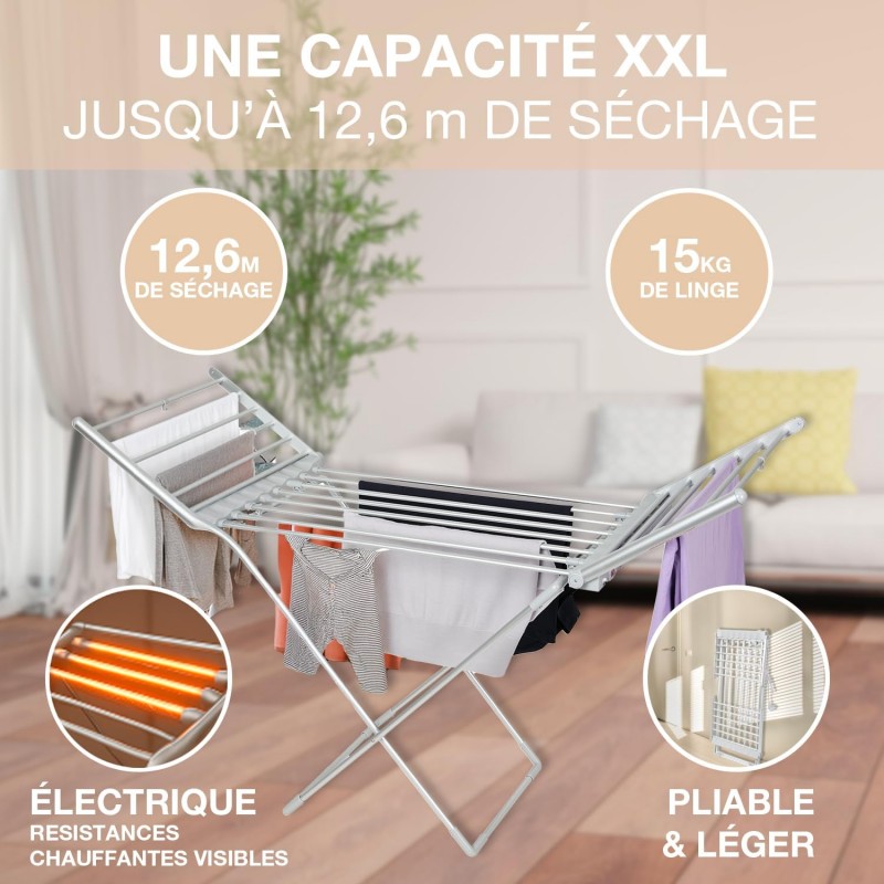 Séchoir Électrique XXL - 1,5m de Longueur - 230W - Température de 45-55°C - Séchage Rapide et Doux pour Jusqu’à 15kg de Linge - Câble de 1,4m - Idéal pour Séchage en Intérieur